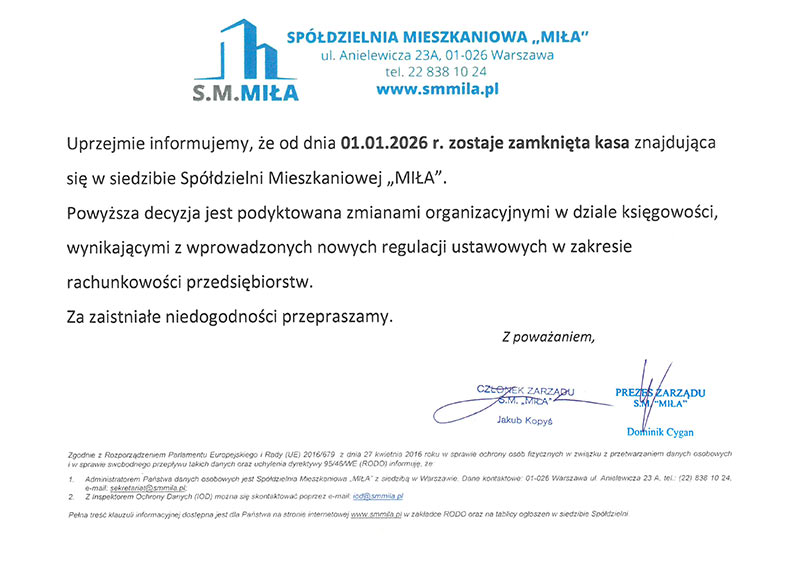 Szanowni Państwo, Informujemy, że w dn. 11.12.2025 r. kasa w budynku SM „MIŁA” będzie nieczynna. Kliknij tutaj aby wyświetlić ogłoszenie …
