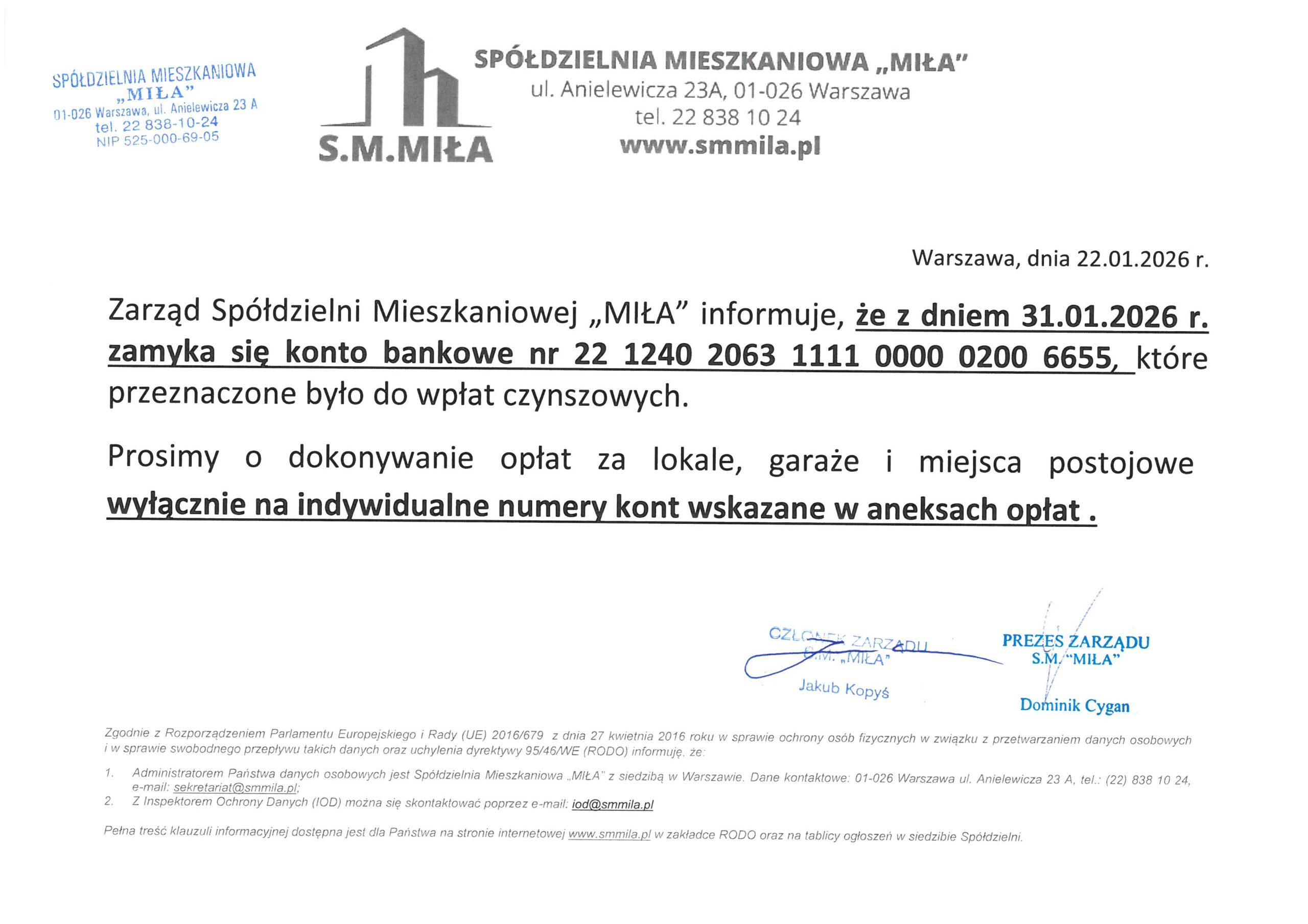 Zarząd Spółdzielni Mieszkaniowej „MIŁA” informuje, że z dniem 31.01.2026 r. zamyka się konto bankowe nr 22 1240 2063 1111 0000 0200…